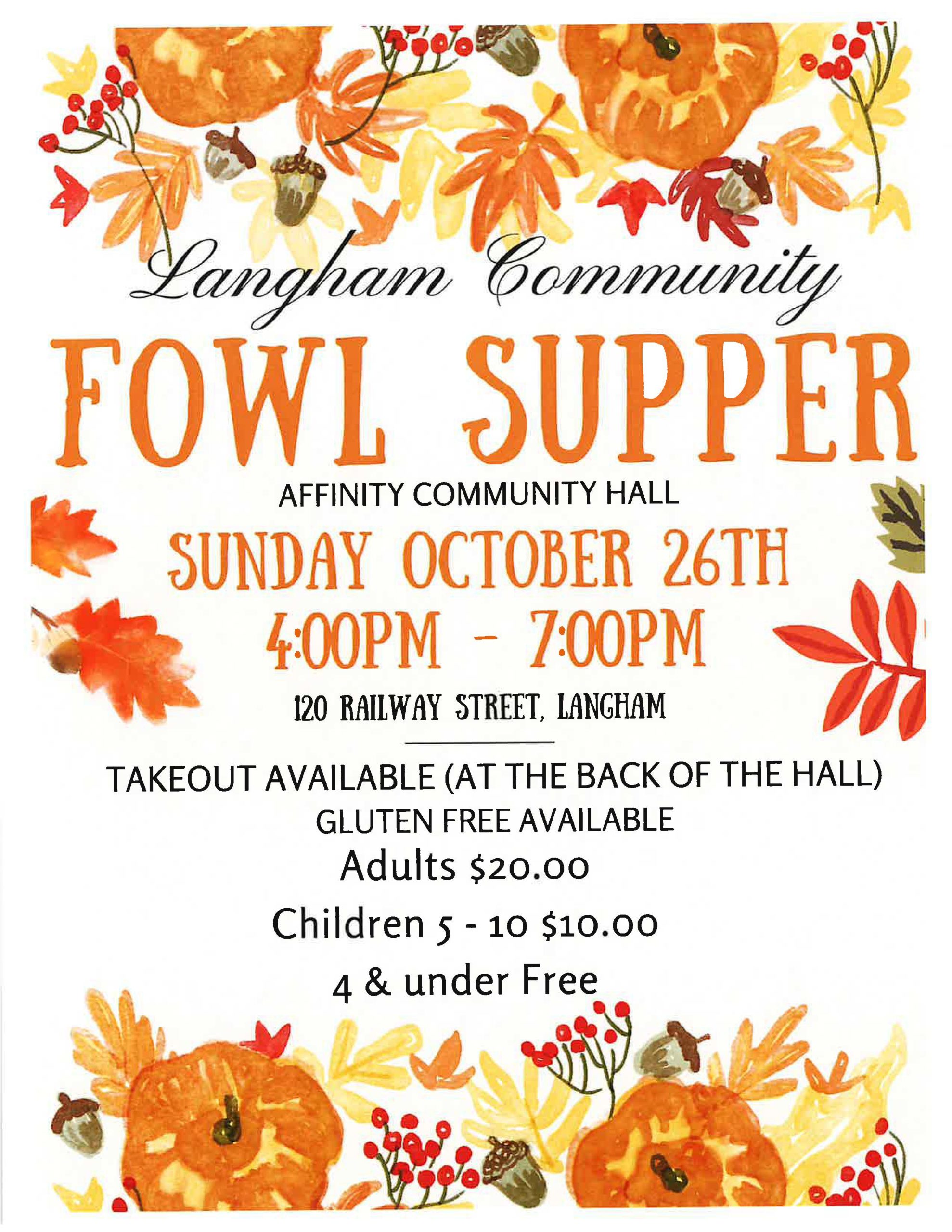 Fowl suppers in Langham date back to the 40’s and 50’s. But at that time, there were several individual churches that held their own. The Legion Hall (where the 8 plex is now) was the in town location for many years. It steadily grew in attendance and for at least one year the Fowl supper was held in both the Legion Hall and the Skating Rink Lobby. When the Langham Community Hall was built, the Hall Board held the Fowl Suppers as a fund raiser for the hall. When the Hall Board was dissolved, the Recreation Department and several churches in Langham and area took over the planning. Currently the Fowl Supper is held the last Sunday of October (subject to change) It boasts one of the best meals held in the area, people attend from Warman, Martensville, Saskatoon, Dalmeny, Borden and Radisson. The menu is always Turkey and all the fixings including pie for dessert. All of which is donated by the generous people of Langham. Donations are accepted from Corporate and private citizens to pay for the Turkeys, but local families donate the time and energy to cook those delicious birds! Recently added is a “takeout” feature where people who are not able to stay, may take their meal home with them in a takeout container provided by the Fowl Supper Committee. The Fowl Supper is a great opportunity to sit and visit with your neighbors and friends of Langham and surrounding area! Please see the calendar of events for the Fowl Supper date for this year!